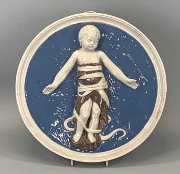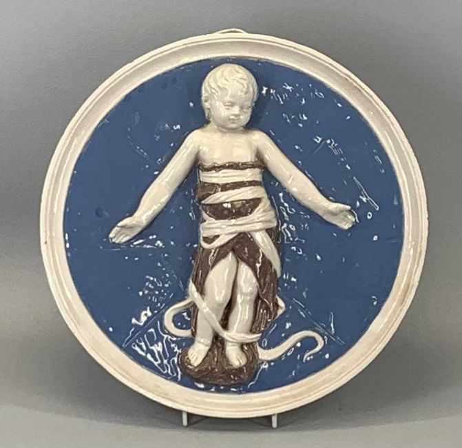 CANTAGALLI FIRENZE CIRCULAR WALL PLAQUE, 20th century, in Della Robbia style with infant in swaddling, impressed marks to reverse, 31cms (diam.)Provenance: private collection Conwy
