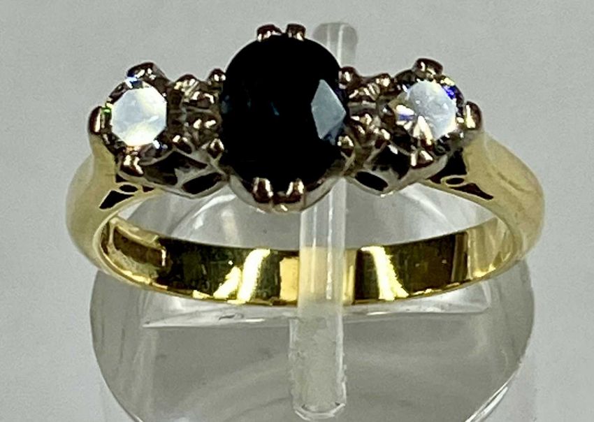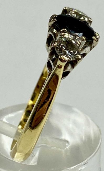 18CT GOLD RING SET WITH CENTRAL SAPPHIRE, flanked with diamond to either side, sapphire approx. 1ct, diamonds approx. 0.5ct total, size OProvenance: private collection Gwynedd