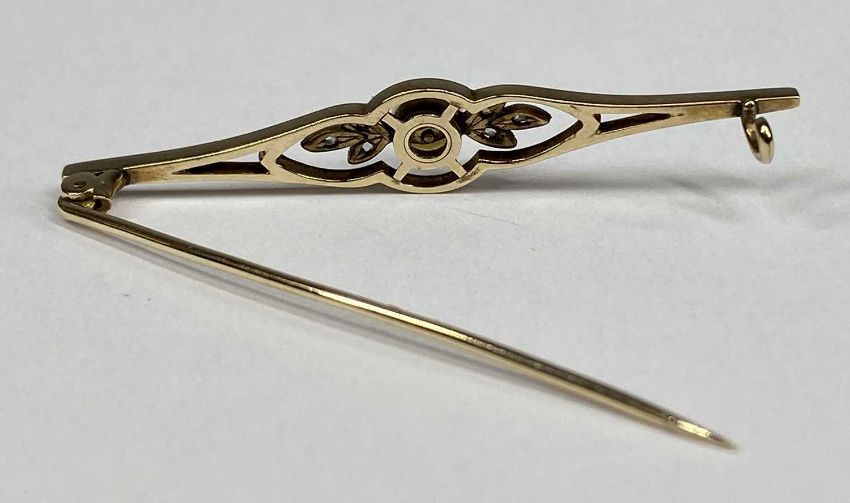 9CT WHITE & YELLOW GOLD BAR BROOCH set with a pearl and diamond chips, 5cms (l), 2.6gmsProvenance: private collection Denbighshire