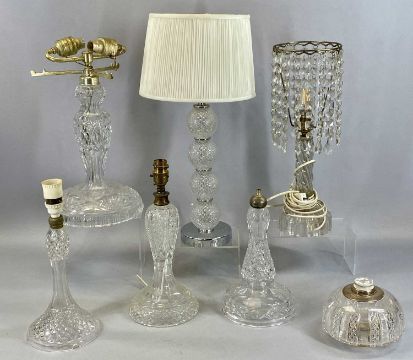 GROUP OF LIGHTING including quality cut-glass table lamp with twin fitting, three other cut glass table lamps (no shades), circular cut glass oil lamp reservoir with silver mount etc.Provenance: private collection Conwy