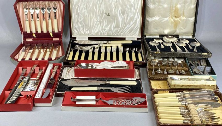 ASSORTED CASED CUTLERY including fish knives and forks, carving set, teaspoons, dessert spoons etc.Provenance: private collection Conwy