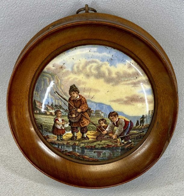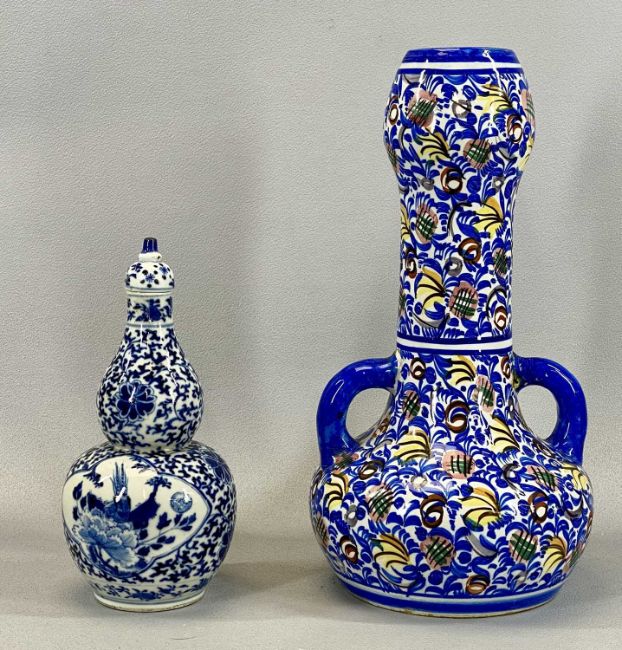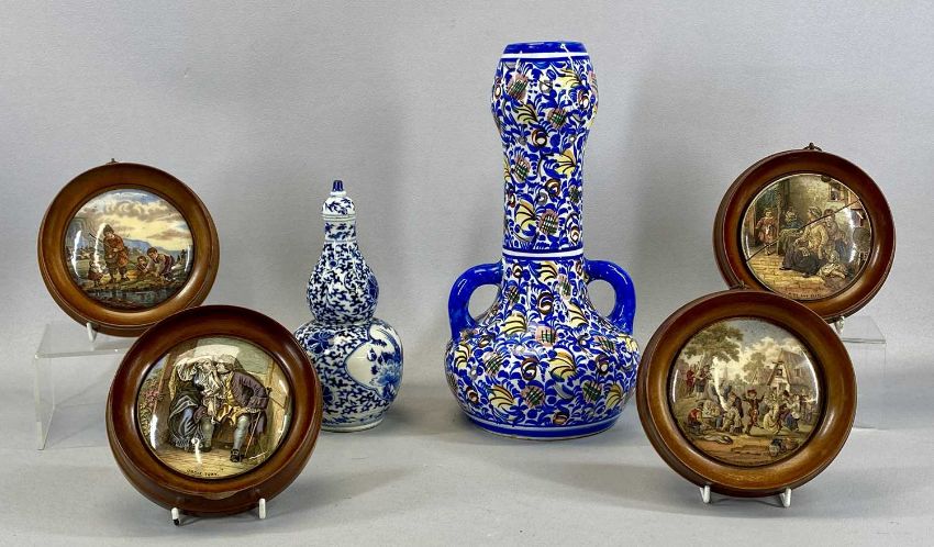 CHINESE DOUBLE GOURD SHAPED BLUE & WHITE VASE, panels decorated with flowers, with cover, 22cms (h), continental studio pottery two handled vase, 32cms (h) and four 19th century Prattware pot lids, framedProvenance: private collection Ynys Môn