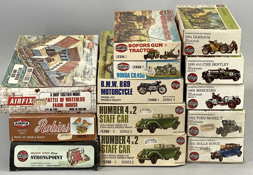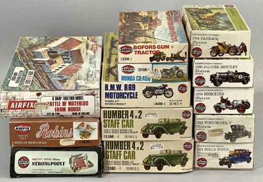 AIRFIX THIRTEEN PLASTIC KITS including military and classic vehicles, birds and motorbikes, contents appear complete but unchecked, together with boxed Meccano Action Packs and other items Provenance: private collection Conwy