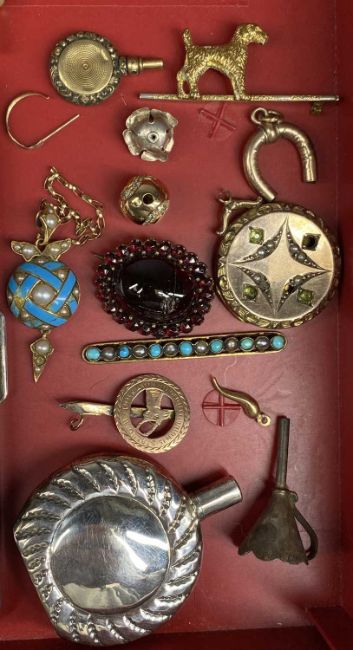 GROUP OF SMALL COLLECTABLES including silver perfume bottle with funnel, various watch keys, EPNS cigarette case and various scrap jewellery etc.Provenance: private collection Denbighshire