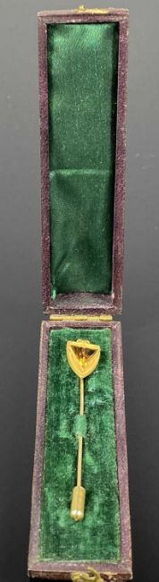 14CT GOLD STICKPIN shield shape and set with orange stone, 3gms, in fitted caseProvenance: private collection Conwy