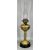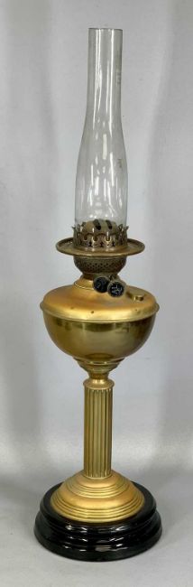 FOUR BRASS OIL LAMPS, late 19th century, three with black ceramic bases, one with blue glass reservoir, one with clear glass reservoir, 47cms (h) the tallestProvenance: private collection Conwy