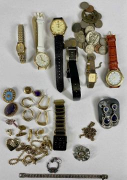 ASSORTED COSTUME JEWELLERY, COINAGE & WATCHESProvenance: deceased estate Conwy