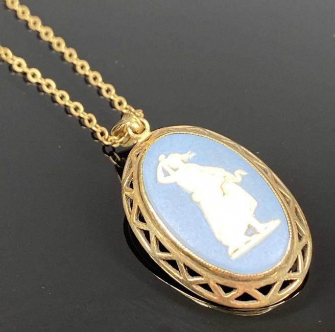 WEDGWOOD BLUE BASALT PENDANT classical figure in pierced 9ct gold mount, 25 x 13mms with chainProvenance: private collection Conwy