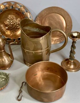 ASSORTED METALWARE including antique pewter quart tankard and eight pewter dinner plates, Arts & Crafts circular copper dish, large copper jug etc.Provenance: private collection Gwynedd