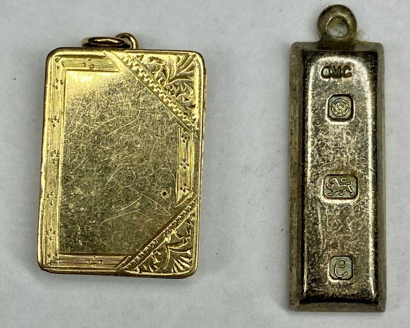 MIXED JEWELLERY, possibly white gold ring set with blue stones, 9ct gold heart shaped locket, 3.6gms, oblong locket with 9ct gold front and back, silver locket chain and ingot and a 9ct gold coin mount, 1.5gmsProvenance: deceased estate Conwy