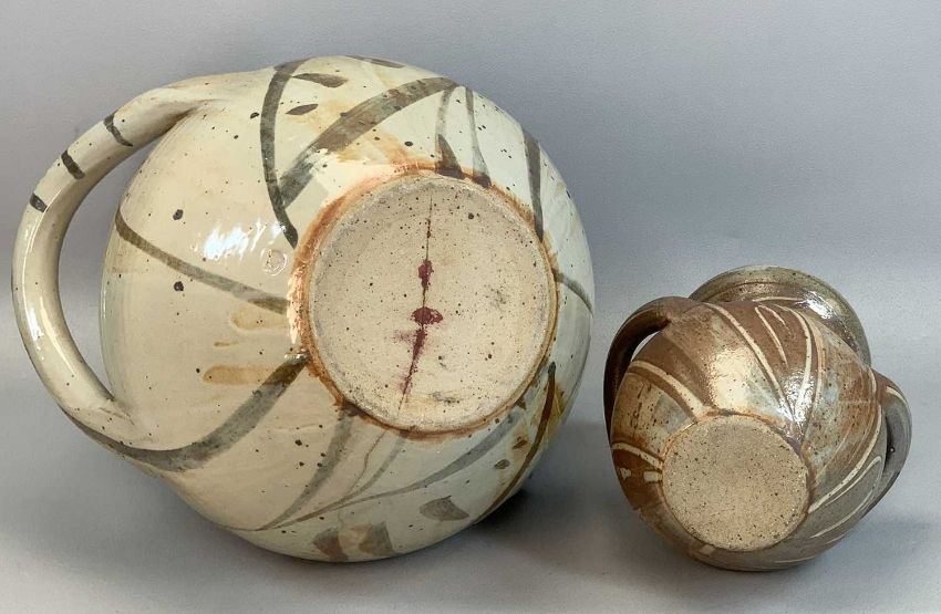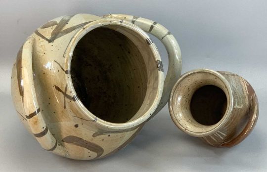 TERRY BELL-HUGHES (Welsh b. 1939) studio pottery two-handled vase - grey/brown glaze with impressed monogram, 30cms (h) and a similar smaller two-handled vase, brown speckled glaze, 22cms (h)Provenance: private collection Gwynedd