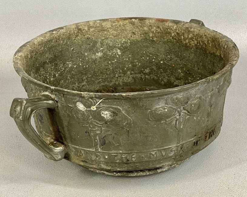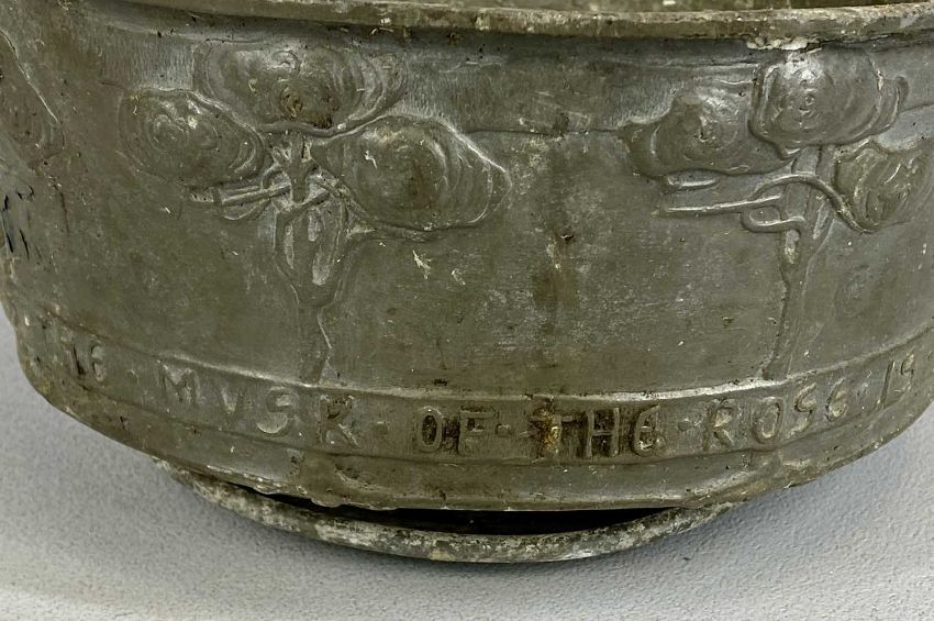 ARTS & CRAFTS PEWTER TWO-HANDLED ROSE BOWL, c.1910, probably Liberty & Co. Tudric designed by David Veazey, body cast with stylised roses and couplet of Lord Tennyson's poem 'Maud' - "And the musk of the roses blown, And the woodbine spices are wafted abroad", on circular foot, 12cms (h), 24.5cms (diam.)Provenance: deceased estate Flintshire