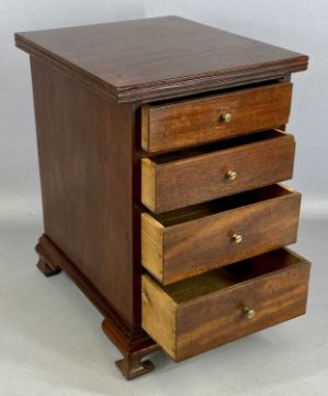 MAHOGANY TABLETOP CHEST, four long drawers with brass knob handles on ogee bracket feet, 38 x 25cms and mahogany tabletop cabinet with gilded brass handles, lift up lid and full front, 37 x 40cmsProvenance: private collection Conwy
