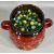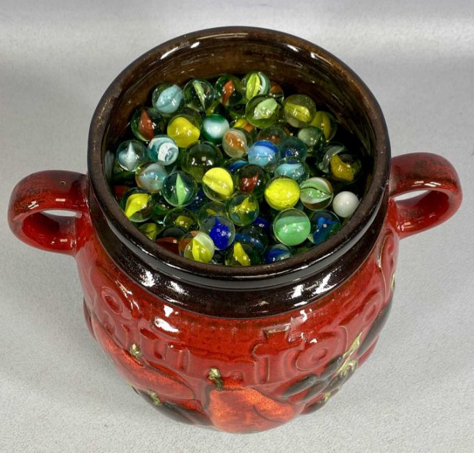 SCHEURICH WEST GERMAN RUMTOPF TWO-HANDLED KITCHENWARE POT, moulded and painted with vegetables, filled with marbles, 23cms (h)Provenance: private collection Conwy