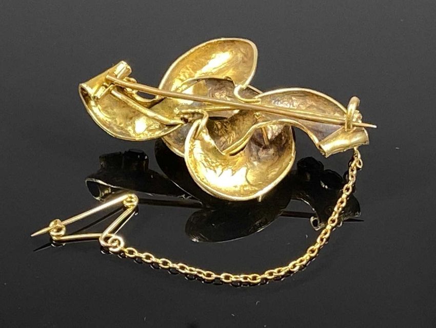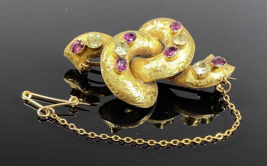 VICTORIAN 9CT GOLD KNOT BROOCH set with coloured glass stones having safety chain, 5.5 x 3.5cms, 9.7gmsProvenance: private collection Conwy