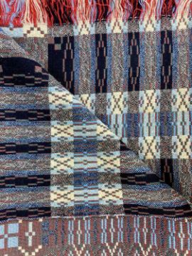PAIR OF WELSH WOOLEN BLANKETS, fringed and double sided, geometric patterns in reds, blues, creams and black, approx. 240 x 170cmsProvenance: private collection Gwynedd