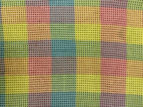 WELSH WAFFLE BLANKET, fringed and double sided, pastel hues of blue, yellow and pink, approx. 200 x 120cmsProvenance: private collection Gwynedd