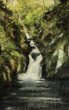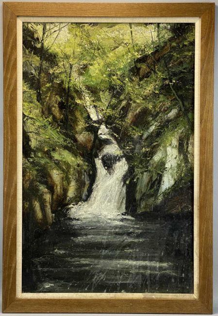 UNKNOWN 20TH CENTURY oil on board - waterfall entitled verso 'Pwll Morwyn', unsigned, 84.5 x 54cms and Keith Andrew limited edition (752/800) colour print 'Snowdrops', signed, titled and numbered in pencil, 49 x 33cmsProvenance: private collection GwyneddComments: framed