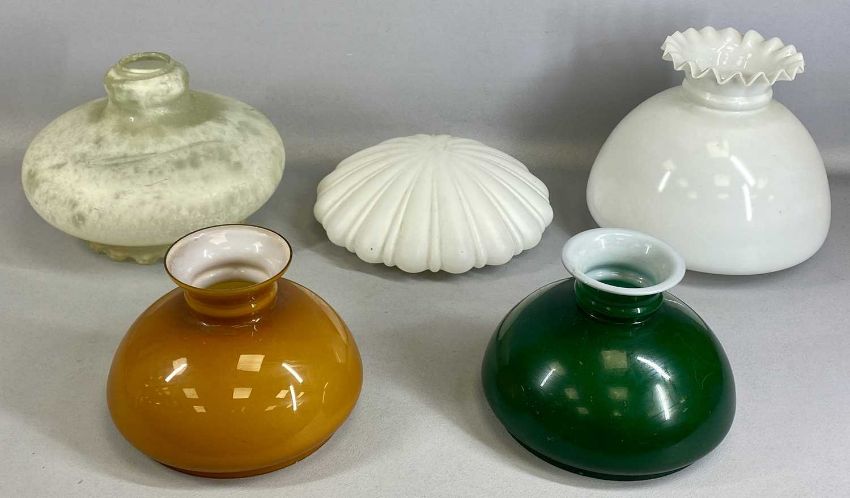 ASSORTMENT OF NINE OPAQUE GLASS OIL LAMP SHADES, 39cms (diam.) the largest