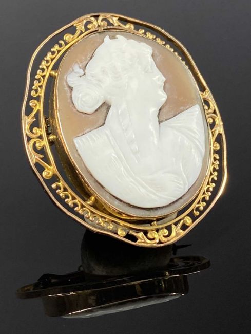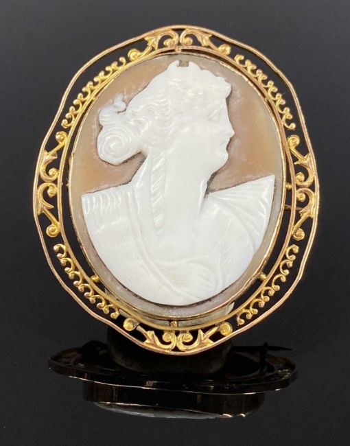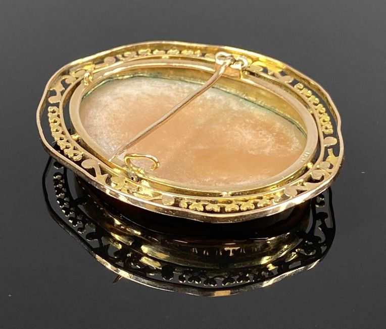 A LARGE OVAL CAMEO PORTRAIT BROOCH in pierced 9ct gold mount, 50 x 45mms, approx 11.8gmsProvenance: private collection Conwy