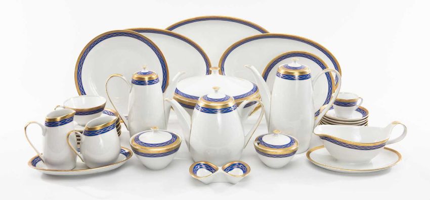 EXTENSIVE CZECHOSLOVAKIAN (CARLSBAD) PORCELAIN DINNER SERVICE FOR TWELVE, 'Brigitta' shape, blue and tooled gilt bands, including coffee cups and saucers, teacups & saucers, coffee pot, teapot, hot water jug, sucriers, milk & cream jugs, plates, tureens, oval dishes, gravy boat, pickle dishes, tureen, plates of all sizes etc. (134)Provenance: private collection PenarthNotes: commissioned in a rare pattern by a Czechoslovakian family and given to the owner's parents in thanks for helping them safely escape the Soviet invasion of 1968. Similar border patterns found on Vienna-style cabinet porcelain from this factory.Comments: excellent, not all of the 134 pieces are illustrated, inspection advised.
