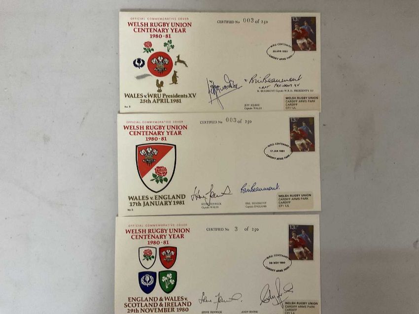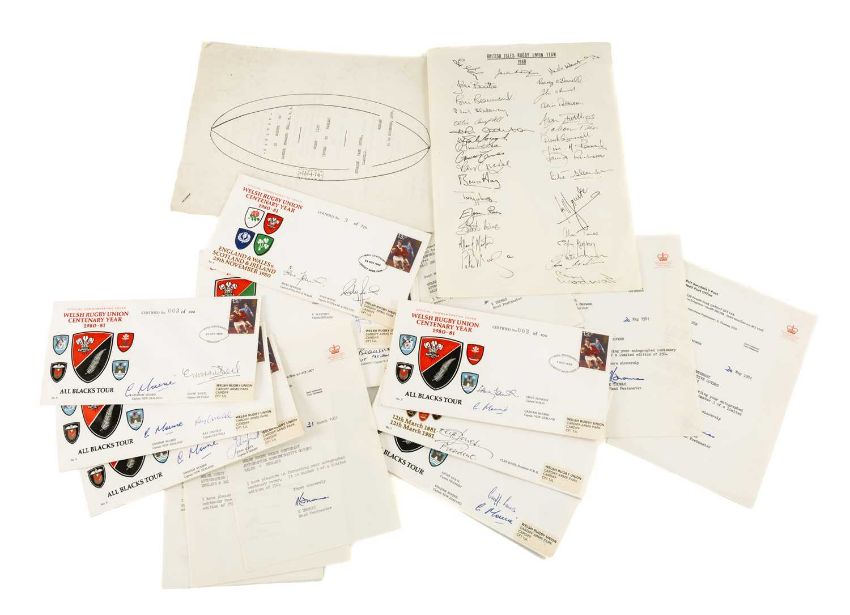 COLLECTION OF RUGBY UNION EPHEMERA including, BRITISH LIONS 1980 AUTOGRAPHS & OTHER EPHEMERA including thirty-three signatures including management and players ( Syd Millar, Neil Murphy, Bill Beaumont, Clive Woodward, Olli Campbell, Terry Holmes, Elgin Rees, Graham Price, Derek Quinnell, etc) all in ink on headed paper, with 10 Welsh Rugby Union Centenary Year 1980 - 1981 Captain signed first day covers, 5 of which are limited and all numbered 3/250 and 5 of which are numbered 3/100 signatures including Cliff Jones, President W.R.U., Graham Mourie of New Zealand, Steve Fenwick of Wales, Geoff Evans of Newport, Geoff Wheel of Swansea, Ray Gravell of Llanelli, John Scott of Cardiff, denoting The All Blacks Tour, (all with postage certificates, in original postage envelopes), and a dinner guest list held at Stradey Park Hotel, Llanelli, 20 November 1978 in honour of Sir Gareth Edwards, BRITISH & IRISH LIONS MEMORABILIA, including approximately 35 ties from various clubs, tickets, tour guide and two tour party blazers from 1971 and 1981 (qty) Provenance: private collection CarmarthenshireCondition: good, viewing advised