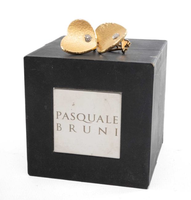 PAIR PASQUALE BRUNI 18CT GOLD & DIAMOND GOLD EAR CLIPS, as hearts with hammered bowed fronts with diamond cluster small hearts, pierced foliate scrolled backs, 21.3g (2)Provenance: private collection Cardiff.Comments: very good overall