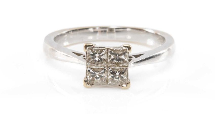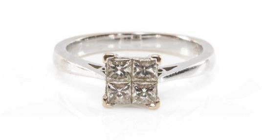 18CT DIAMOND RING, square set with 4 princess cut diamonds, tot diamond wt appr. 1ct, gross wt. 3.4gProvenance: private collection Cardiff.Commnets: excellent, ring size K/L