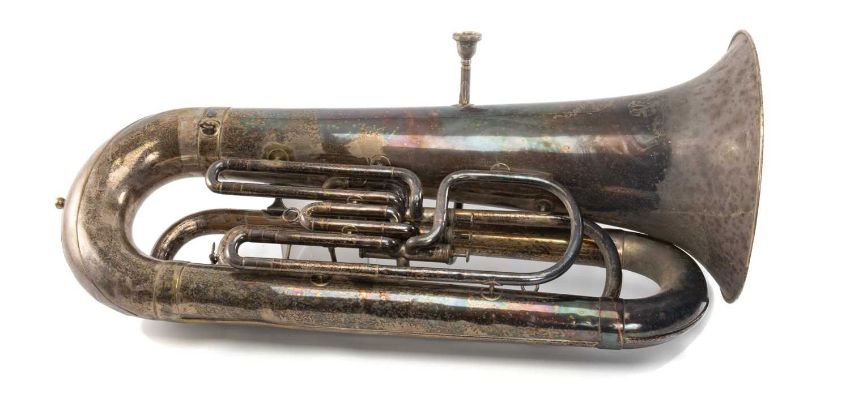 EARLY 20TH CENTURY BESSON & CO. 'SYSTEME PROTOTYPE' TUBA, silver plated, bell with floral engraved decoration, inscribed 'Presented by Mrs Helen Grundy August 1906', Class A, Besson 13 mouthpiece, bell 40cms (dia.)Provenance: private collection SwanseaComments: dings and bumps, wear and tarnish, untested