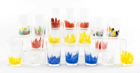 COLLECTION OF CONTEMPORARY GLASSWARE comprising 19 x hand blown beakers, 3 x blue, 2 x white, 5 x yellow, 5 x red, 4 x multi-coloured (19)Provenance: private collection Vale of GlamorganComments: no apparent damage, one white beaker appears water stained, inspection advised