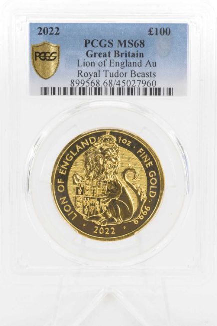 ELIZABETH II 2022 1OZ 24K GOLD LION OF ENGLAND £100 COIN, Royal Tudor Beasts Collection, Professional Coin Grading Service (PCGS) certified MS68, in sealed capsule Provenance: deceased estate GwyneddComments: Professional Coin Grading Service (PCGS) certified MS68, PCGS certification guarantees authenticity and grades coins on a numerical scale from 1-70, with 70 being the highest grade assigned, viewing recommended