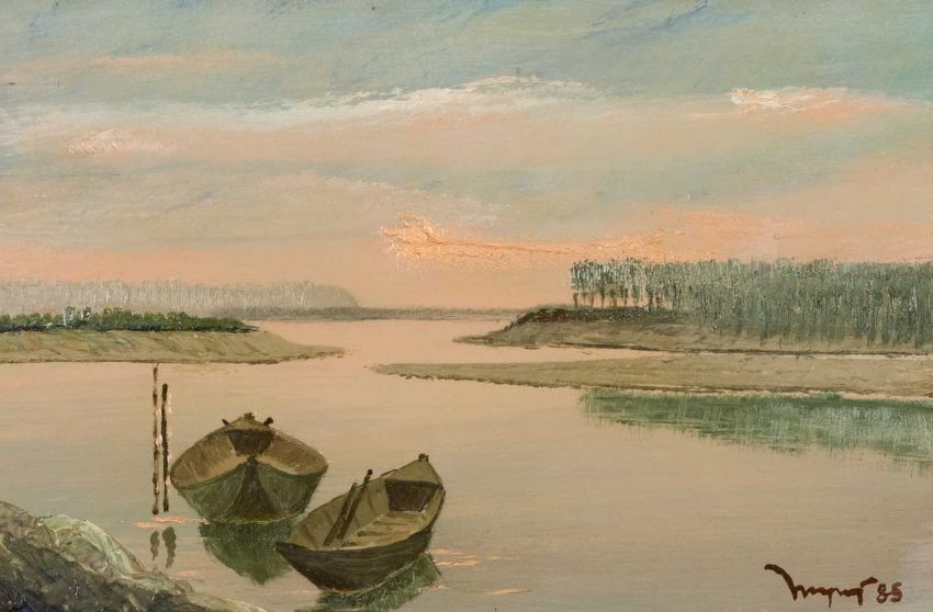 ITALIAN SCHOOL oil on board - fishing punts at dawn, indistinctly signed, 19 x 29cms, together with another by the same artist, 16 x 26cms (2)Provenance: private collection LondonComments: framed and glazed