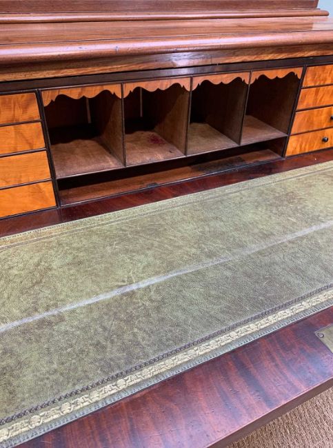 19TH C. FLAME MAHOGANY SECRETAIRE BOOKCASE, moulded cornice with decorative flame mahogany frieze below, open bookcase with three adjustable shelves, pull-out secretaire drawer, fitted interior and inset green leather tooled writing surface, two cupboard doors which open to three slide drawers, raised on plinth base, 234 (h) x 114 (w) x 55cms (d)Provenance: private collection SwanseaComments: two-part, minor bumps and scratches, good colour, appears to free of damage, inspection advised