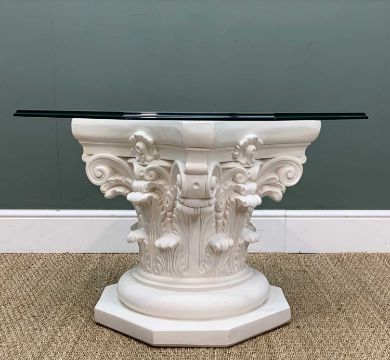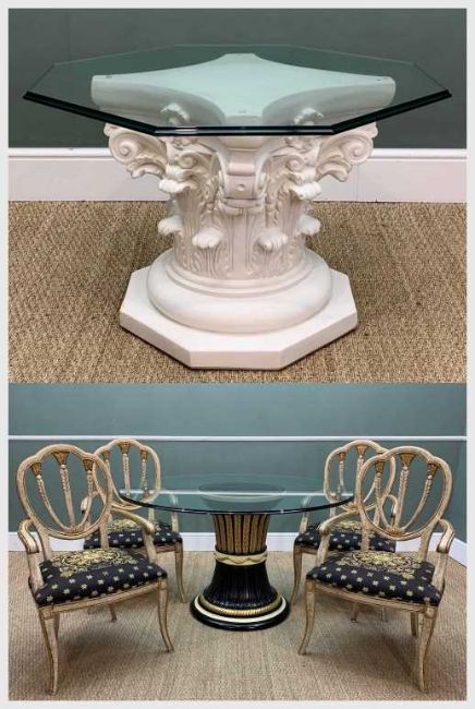 'VERSACE' STYLE FURNITURE including, GLASS-TOP CORINTHIAN CAPITAL TABLE, 56 (h) x 80cms (dia.), together with 'VERSACE' STYLE GLASS TOP TABLE WITH FOUR PAINTED GEORGIAN-STYLE CHAIRS, tear to seat fabric, chair frames loose, column base with split (6)Provenance: private collection GwentComments: condition in description