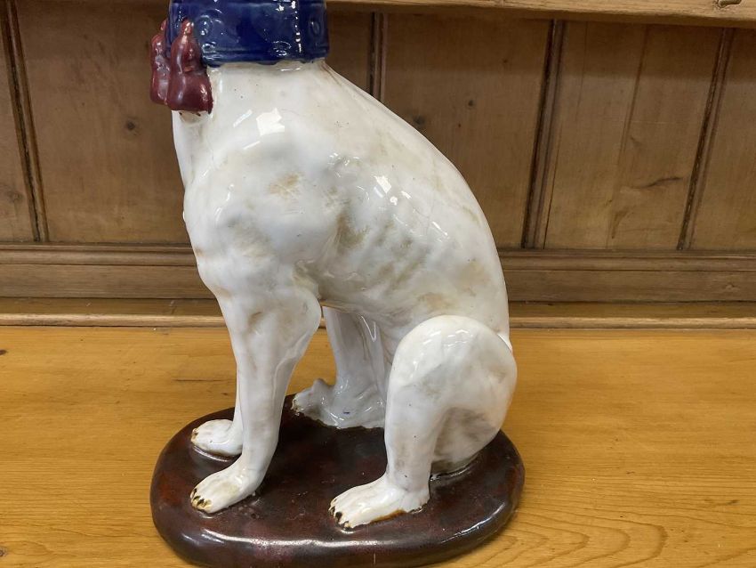 PAIR CONTINENTAL FAIENCE FIGURES OF GREYHOUNDS, seated on oval bases, 35cms (h) (2)Provenance: private collection Bridgend