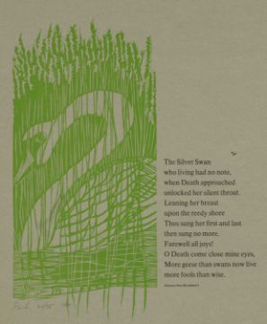 ‡ PAUL PETER PIECH (American-Welsh 1920-1996) two smaller woodcuts - limited edition (22/75) two colour lithograph with poem from Orlando Gibbons, 'The Silver Swan', signed and dated 1971, 52 x 38cms together with another limited edition (29/100) lithograph with verse from Richard II, Act II, Scene I by William Shakespeare, signed and dated 1971, 51 x 19cmsProvenance: were gifted by the artist to the Bertrand Russell Peace Foundation, proceeds will help pay for renovations of Russell's old home in CornwallComments: unframed
