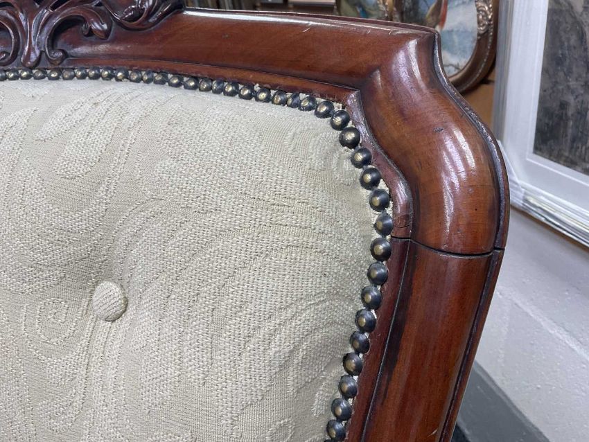 MID-VICTORIAN CARVED WALNUT LIBRARY ARMCHAIR, leaf scrolled carved cresting rail, scrolled arms, serpentine seat on turned legs with ceramic castors, upholstered in lemon floral patterned fabricProvenance: private collection Bridgend