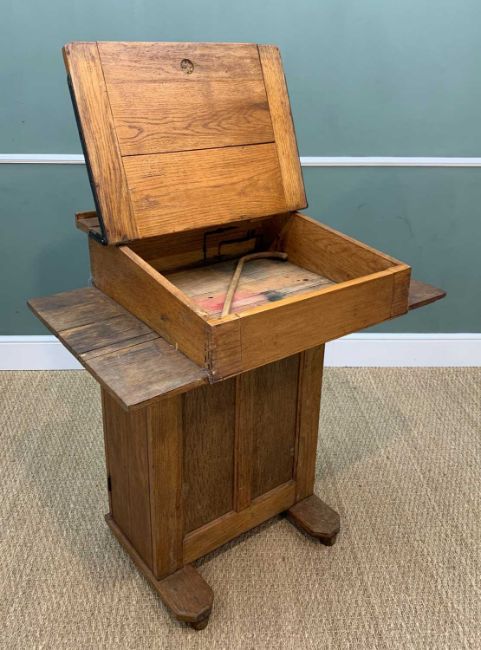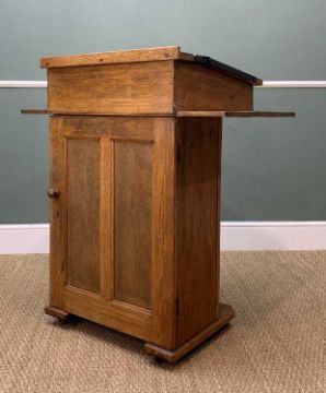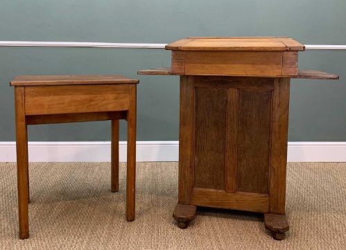 TWO VINTAGE SCHOOL DESKS to include a stained beech and oak, both with angles closures, ink receptacles, one with cupboard in front, possibly teacher's desk, 102 (h) x 91cms (w) (2)Provenance: private collection PembrokeshireComments: ordinary used condition, inspection advised