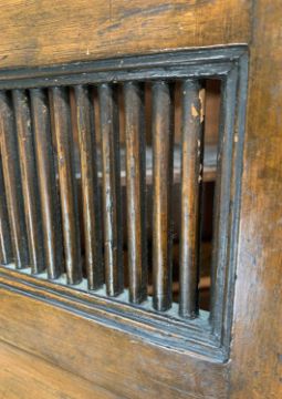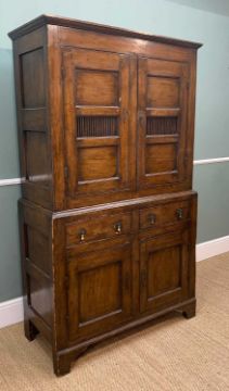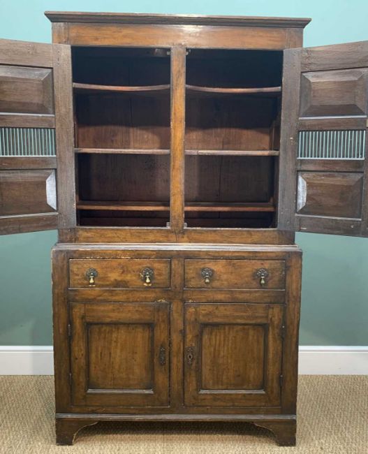 19TH C. WELSH JOINED DEAL 'BREAD & CHEESE' CUPBOARD, Caernarfonshire, shallow cornice above panelled cupboard doors with central spindle ventilation grilles, above pair frieze drawers and cupboard base, bracket feet, 106 (w) x 47 (d) x 184cms (h)Provenance: private collection LondonComments: some woodworm, particularly to the upper cupboard top panels as pictured, later varnish, inspection advised