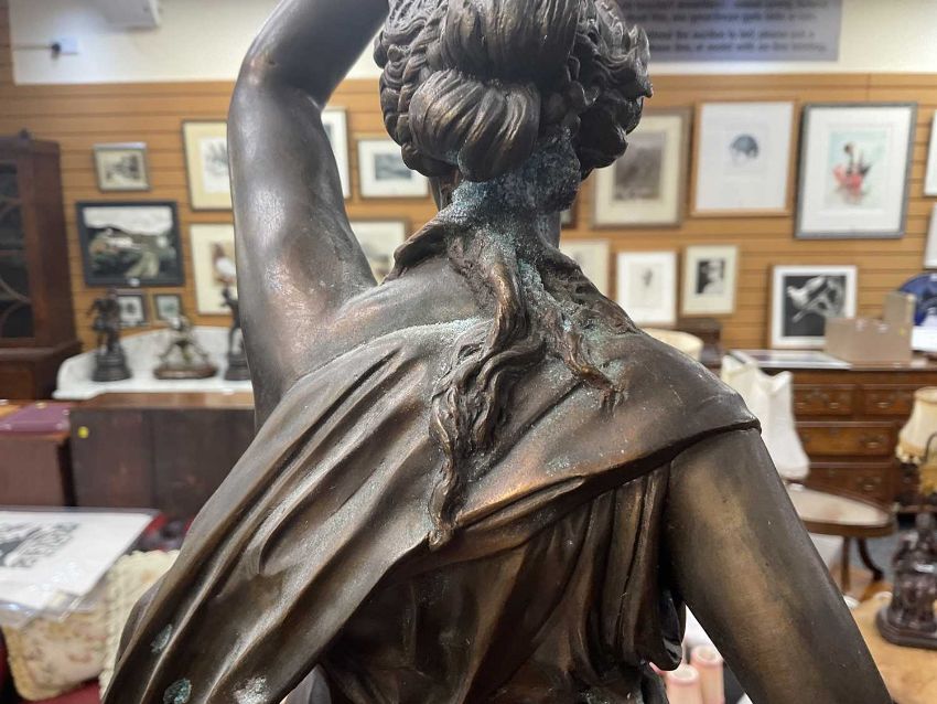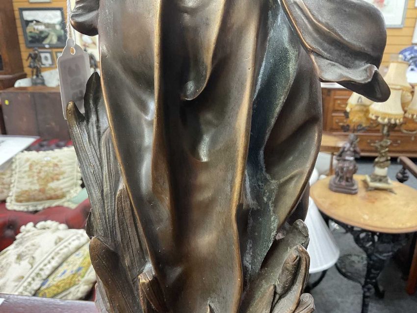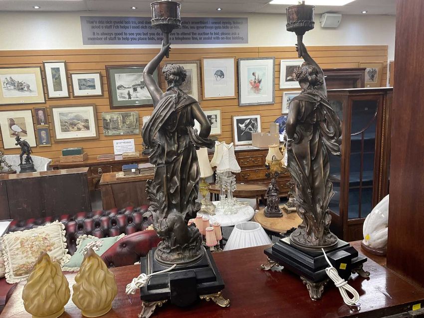 PAIR PATINATED SPELTER FIGURAL TABLE LAMPS, classical figures holding up torches, on Belgian slate plinths raised on bracket feet, yellow glass shades, 100cms (h) (2)Provenance: private collection Bridgend