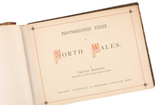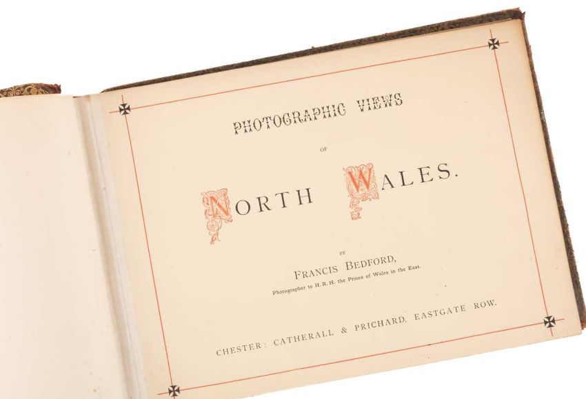 FRANCIS BEDFORD, photograph album - 'Photographic Views of North Wales', Chester c. 1870s, 30x mainly landscapes, including tall ships in Porthmadog and quarrymen and velocipedes in Llanberis, each 10.5 x 15cms, titles and credits, card mounts, contemporary gilt embossed leather covers rubbed, small oblong 4to.,Comments: boards rubbed, spine cracked inside, some faded margins to photos, flyleaf owner signed, also inscribed 'Second Series', all in pencil.