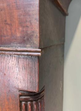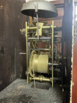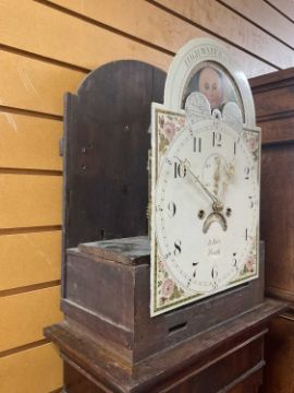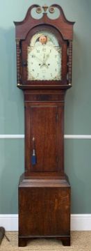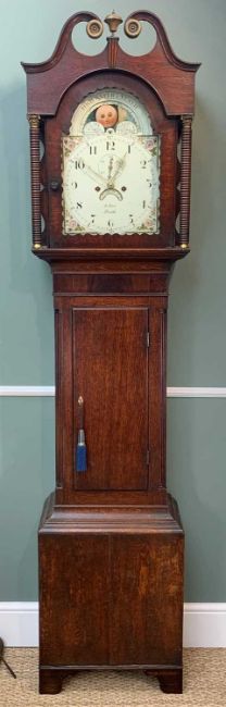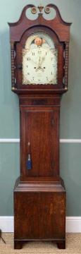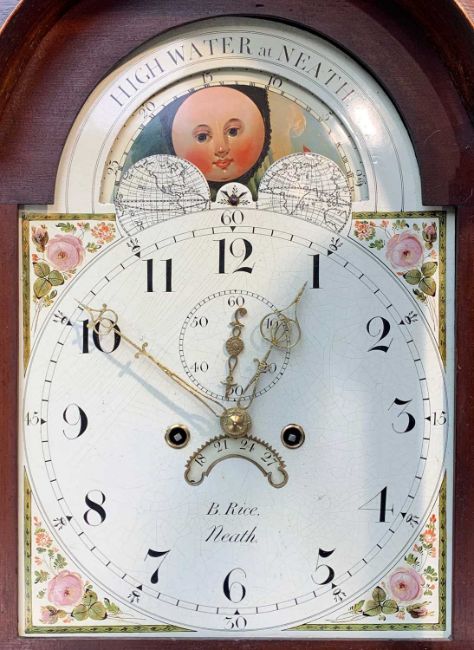 EARLY 19TH CENTURY WELSH OAK & MAHOGANY LONGCASE CLOCK, painted Roman dial with subsidiary seconds and calendar aperture, signed 'B. Rice, Neath' with moon phase in the arch, swan neck pediment between real moulded columns, reeded quarter column trunk and box base raised bracket feet, eight-day movement, dial 11.5in (dia.), 215cms (h)Provenance: private collection SwanseaComments: dial with original craquelure and paint, case missing back legs, loose moulding to trunk, generally good condition