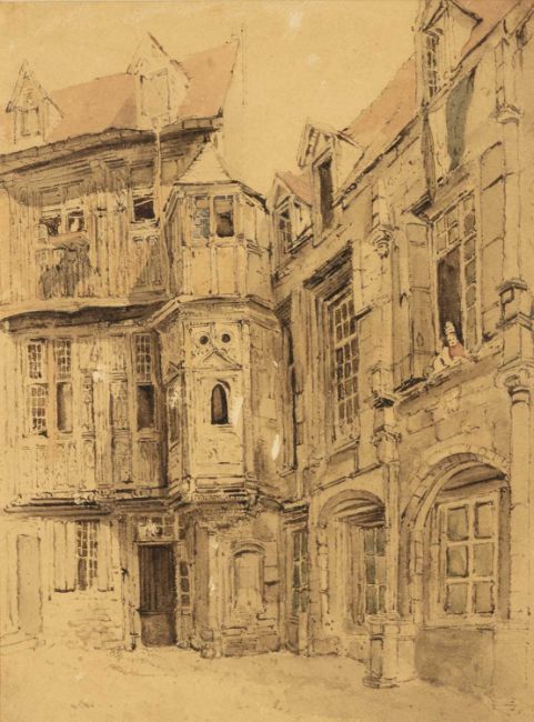 CIRCLE OF SAMUEL PROUT (British 1783-1852), ink and watercolour - Corner at St. Armand (Rouen), a figure in window, inscribed on Gallery label verso 'From Croft House Ambleside sale 12/6/28 E.H.', 38 x 28cmsProvenance: With Grundy & Smith, Manchester; private collection LondonAuctioneer's Note: Cf. National Gallery of Wales (NWM A 19751) for a similar pencil study by Prout.Comments: faded, framed and glazed