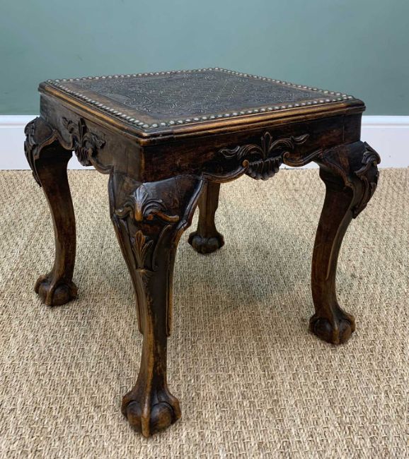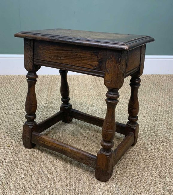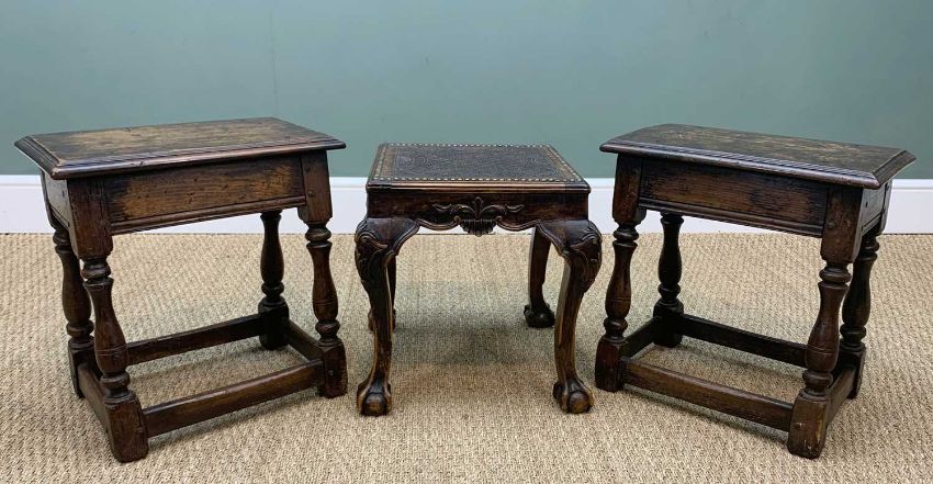 THREE ANTIQUE STOOLS, comprising two 17th C style joined oak stools (aka 'coffin' stools), and a rococo style dressing stool (3)Provenance: private collection Vale of GlamorganComments: general used condition.