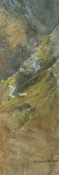 ‡ MALCOLM EDWARDS (Welsh b.1934) watercolour - Welsh mountain scene with farmer and sheepdogs gathering the flock, entitled verso 'First Gather', signed, 31 x 11cmsProvenance: private collection ConwyComments: framed and glazed
