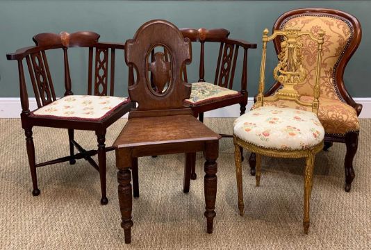ASSORTED SEATING FURNITURE including, Victorian ladies balloon back nursing chair, oak hall chair, 19th century Regency style gilt wood salon chair with lyre splat, two mahogany corner chairs etc, (8)Provenance: private collection BridgendComments: