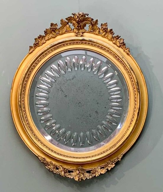 THREE DECORATIVE WALL MIRRORS, including Victorian oval gilt gesso girandole, 69cm h, Edwardian circular mirror with half fluted pat end vine leaf crest and base, 47cms dia., and modern oval mirror 80cms dia. (3)Provenance: private collection LondonComments: some repainting