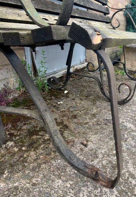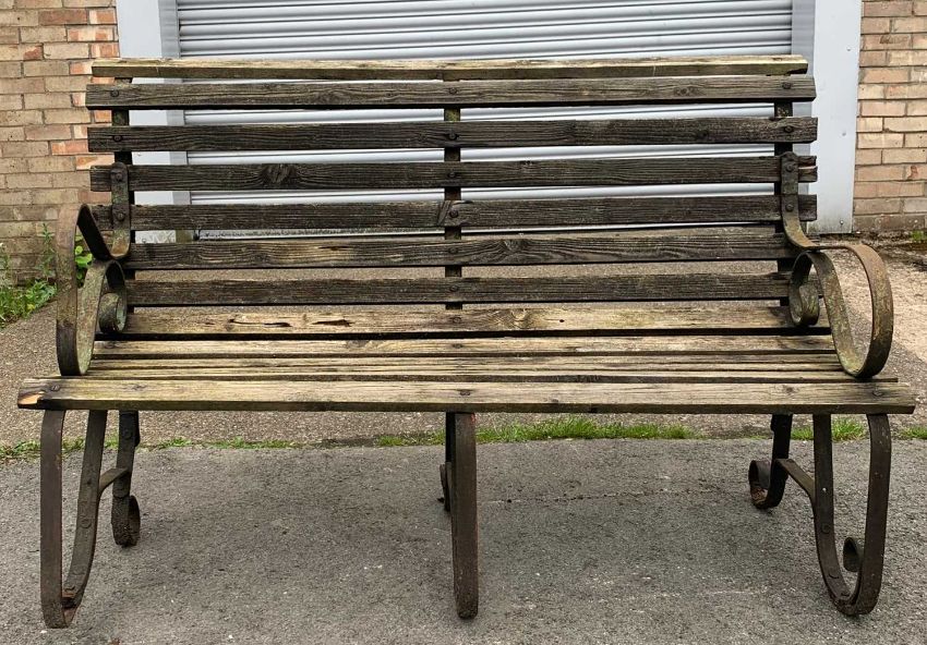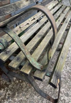 VINTAGE TRADITIONAL GARDEN BENCH, weathered wooden slats, iron supports, 97 (h) x 144cms (w)Provenance: consigned via West WalesComments: some slates rotten, supports deformed in places, inspection advised