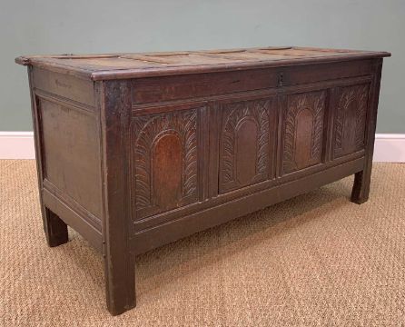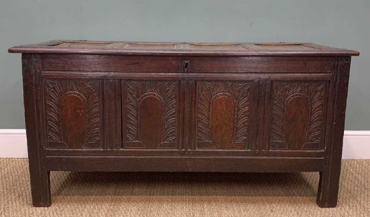 EARLY 18TH C. JOINED OAK COFFER, four panelled front carved with lunette ornament, 140 (w) x 56 (d) x 68cms (h)Provenance: private collection LondonComments: ordinary used condition, losses, splits and shrinkage, inspection advised