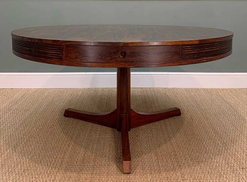 ROBERT HERITAGE FOR ARCHIE SHINE: MID-CENTURY ROSEWOOD DRUM CENTRE TABLE, designed c. 1955, circular top, four matching frieze drawers between reeded panels, tripod pedestal base, part of the 'Bridgeford' furniture range sold through Heals and Harrods, 73 (h) x 143cms (dia.)Provenance: private collection CardiffComments: A10 certificated no. 24GBA10E0ON8I. Top re-varnished poorly displaying swirl marks and glitter under, a few minor veneer losses to table edge, but otherwise appears in sound condition with little damage, the base will unscrew from the top for ease of transportation